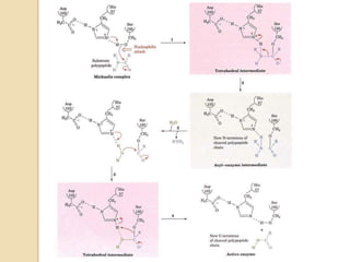 Serine proteases use a catalytic triad of Serine, Histidine, and Aspartic acid. Serine 195 performs a nucleophilic attack in a covalent catalysis step to form a tetrahedral intermediate. Histidine 52 donates a proton and Aspartic acid 102 is important for catalysis