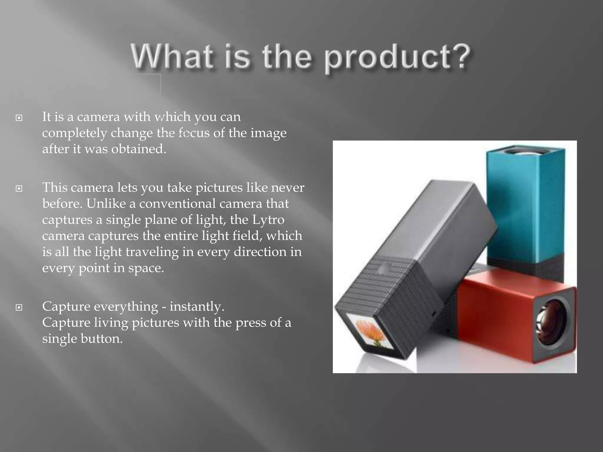 This document summarizes a revolutionary camera that captures the entire light field rather than a single plane of light, allowing the user to change the focus of an image after it has been taken. Key features include a touch screen that allows focusing anywhere in the photo, storage of hundreds of photos, low light capability, and focus without auto-focus delay. The camera's novel design and light field technology represent a major change from conventional cameras and allow refocusing photos as if returning to the original scene.