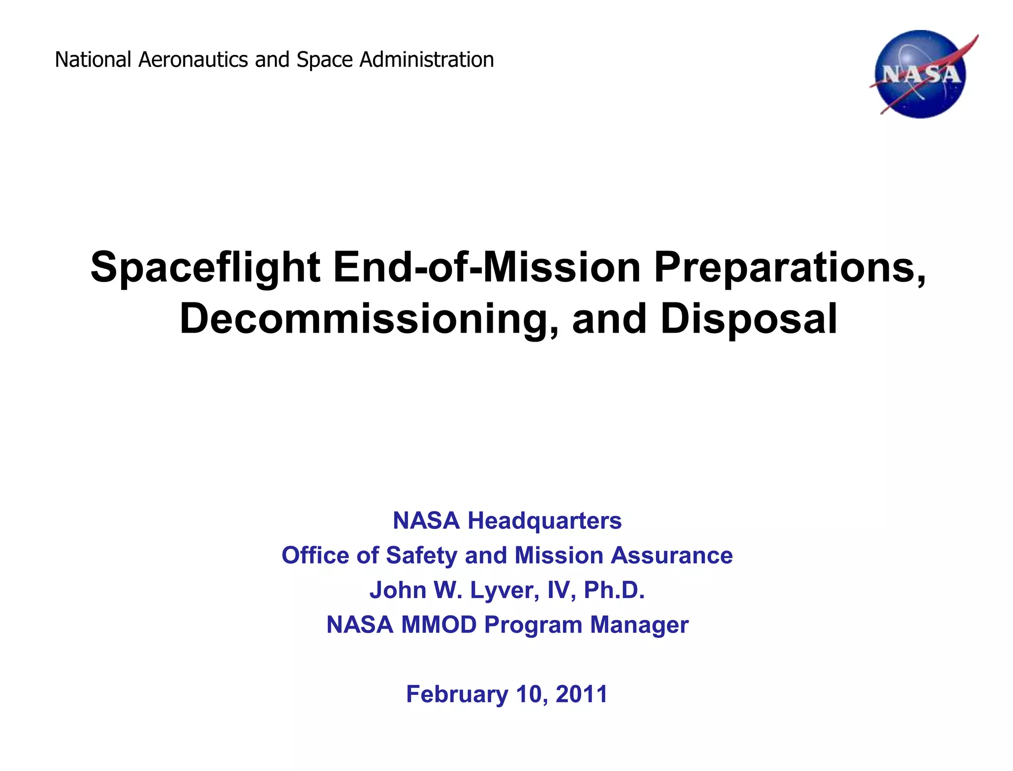 This document discusses NASA's policies and procedures for decommissioning and disposing of spacecraft at the end of missions. It outlines the governing policies at the national and NASA level that require planning for post-mission disposal to limit orbital debris and environmental risks. Key requirements include developing end-of-mission plans, passivating spacecraft by depleting energy sources, and either de-orbiting from orbit or moving to a storage orbit above 2,000 km. The document reviews the disposal guidelines and regulations regarding debris mitigation and risk management.
