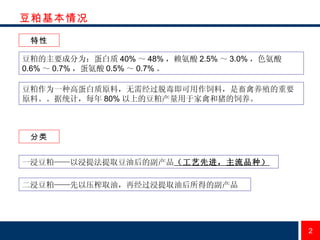 豆粕是大豆提取油后的副产品,主要作为高蛋白饲料,广泛用于家禽和猪的饲养。其主要成分包括40%至48%的蛋白质,需求受养殖业和替代品价格影响。豆粕的消费高峰通常在每年的7至9月,相关的期货合约在大连商品交易所上市。