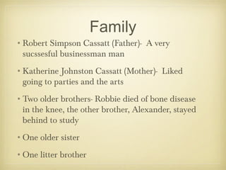 Mary Cassatt was born in 1844 in Pennsylvania to a wealthy businessman father and mother who enjoyed the arts. She had two older brothers, one who died young, and an older sister. When she was young, Cassatt's family moved frequently between Europe and the United States, living in Paris and Germany from ages 7 to 9 before returning to America. Cassatt would go on to become a famous American painter known for her paintings of mothers and children.
