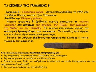 Γραμμική Β : Συλλαβική γραφή. Αποκρυπτογραφήθηκε το 1952 από