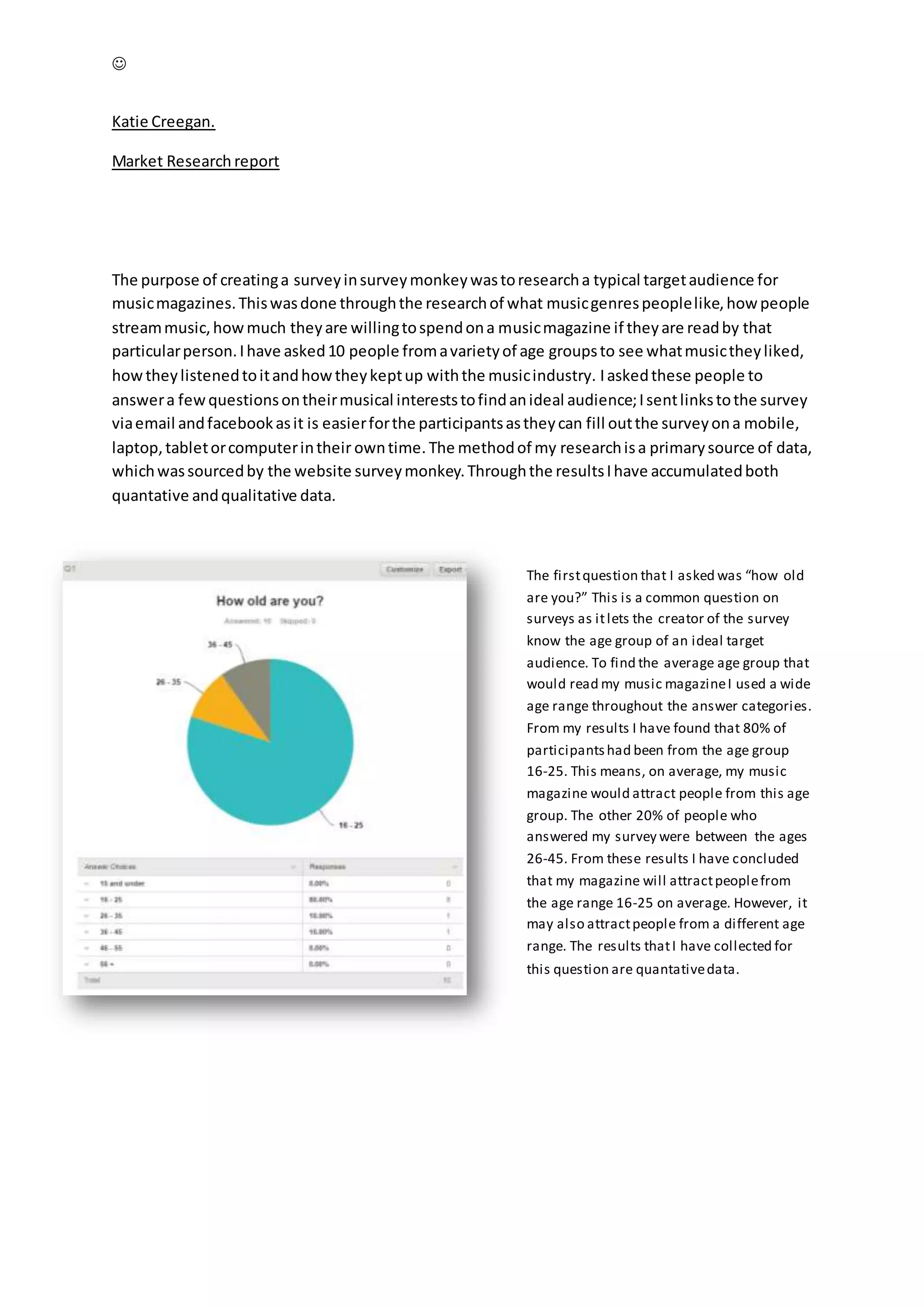 Katie Creegan conducted market research through a survey on SurveyMonkey to determine the target audience for a music magazine. She surveyed 10 people of varying ages on their musical interests, how they listen to music, and how much they would be willing to pay for a music magazine. Based on the results, she found that the average target audience would be 16-25 years old and interested in indie, rock, and electronic music. Most listen to music on YouTube and would pay £1-£2.50 for a magazine. The magazine should include musical trends, exclusive interviews, and posters to attract readers. While most would not read the magazine online, including a digital version may expand the audience.