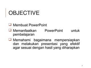 Dokumen ini memberikan panduan tentang cara membuat dan menyampaikan presentasi yang efektif menggunakan Microsoft PowerPoint. Berbagai aspek penting diperhatikan, seperti desain slide, pemilihan warna, jenis font, dan penggunaan visualisasi untuk meningkatkan pengalaman audiens. Penyaji juga diingatkan untuk berinteraksi dengan audiens dan mengatur waktu presentasi dengan bijaksana.