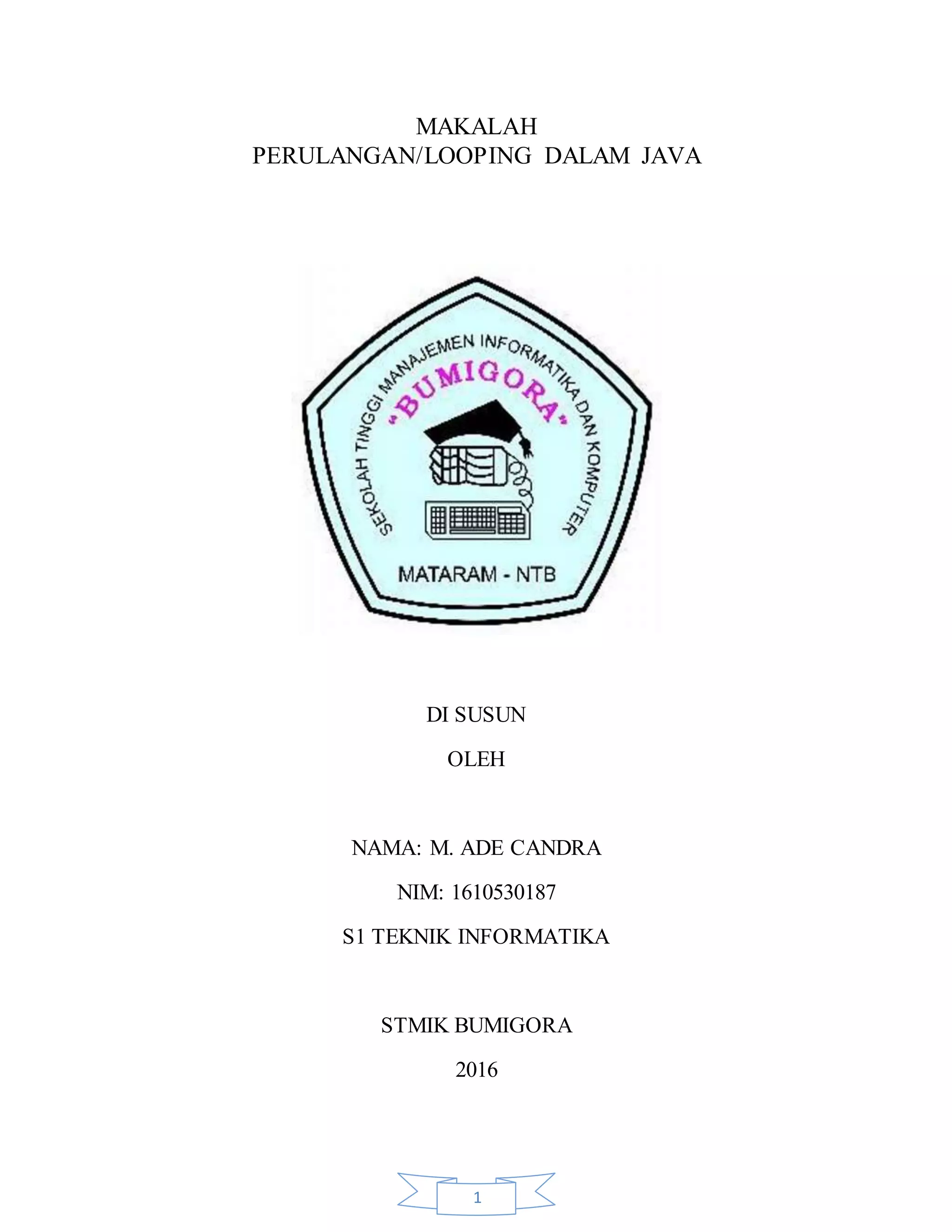 Makalah ini membahas tentang perulangan/looping dalam bahasa pemrograman Java. Terdapat tiga jenis perulangan yaitu for, while, dan do while. Perulangan for memiliki tiga parameter yaitu nilai awal, nilai akhir, dan operator increment/decrement. Sedangkan perulangan while dan do while hanya memiliki satu parameter. Perbedaan utama antara while dan do while adalah do while akan menjalankan instruksi terlebih dahulu sebelum mengecek kondisi.