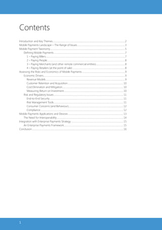 The document discusses the mobile payments landscape, addressing various aspects like taxonomy, economic drivers, risks, and the necessity for interoperability. It highlights the potential growth of mobile payments, predicts significant transaction volumes by 2013, and notes challenges like technological barriers and consumer acceptance. The paper emphasizes the importance of a cohesive payments strategy for financial institutions and other stakeholders to capitalize on emerging opportunities in mobile commerce.