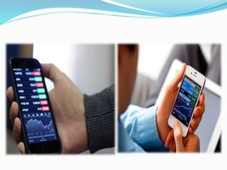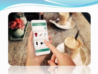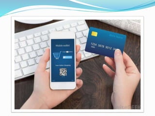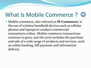 Mobile commerce, or m-commerce, involves using mobile devices like cell phones and laptops to conduct online commercial transactions. It allows people to purchase a wide range of products and services through their mobile devices, such as online banking, bill payment, and information delivery. The variety of enabled devices has expanded to include smartphones and tablets. Social media platforms have also increased m-commerce by letting users buy products directly through apps. Some key applications of m-commerce discussed include finance, retail, marketing, ticketing, entertainment, hotel reservations, healthcare, work communications, information access, and gaming.