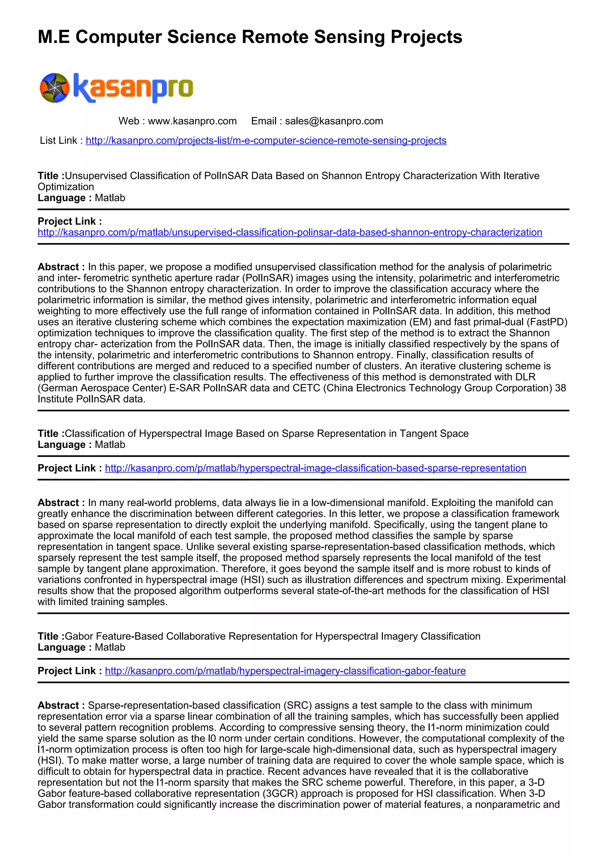 The document outlines various MATLAB-based projects focused on remote sensing and hyperspectral image classification. Key projects include methods for unsupervised classification of polinsar data, hyperspectral image classification using sparse representation, and techniques for object extraction from remote sensing images. Additionally, the document addresses innovative approaches to segmentation, change detection, and feature extraction, highlighting the effectiveness of the proposed methods through experimental results.