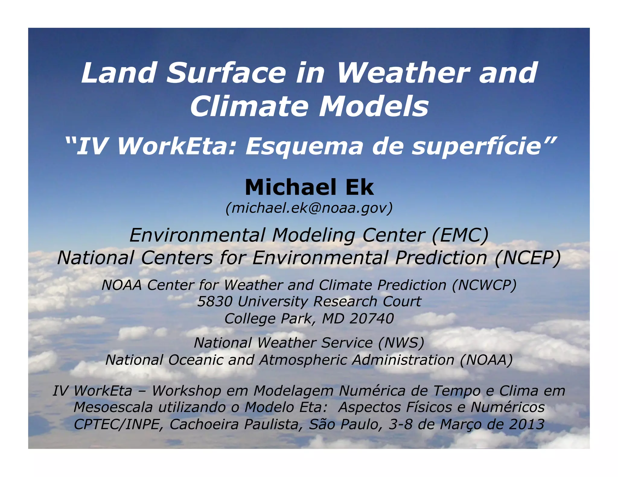 This document discusses land surface modeling in weather and climate models. It describes the role of land surface models in providing surface boundary conditions, such as heat and water fluxes. It outlines the requirements for land models, including atmospheric forcing data, appropriate physical representations, land cover and soil data, and initial land states. It then covers applications for weather and climate modeling, validation of land models, ongoing work to improve them, and their expanding role within Earth system modeling.
