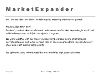 MarketExpander assists small and mid-sized companies expand their domestic and international markets. They help clients define market expansion strategies and operational plans. MarketExpander also takes on operational roles to help clients reach sales targets and expand market share. Their services include developing strategic business plans, providing interim senior management, and conducting workshops to create 1-page business plans. Client testimonials praise how MarketExpander has helped companies transform, secure important deals, and guide management teams to define targets and actions. MarketExpander is led by partners with extensive experience in international sales, negotiations, business development, and project management from industries like telecommunications.