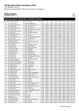 This document provides unofficial results from the TUI Marathon Palma de Mallorca 2014 held on October 19, 2014. It lists the top 54 male finishers, including their name, nationality, age category, split times, and final time. The first place finisher was Dr. Antoni Roldan Mercadal of Spain with a time of 2:30:08.
