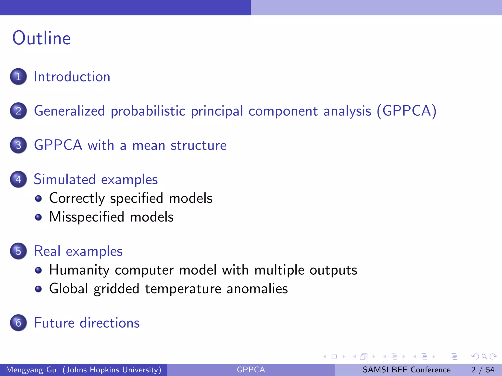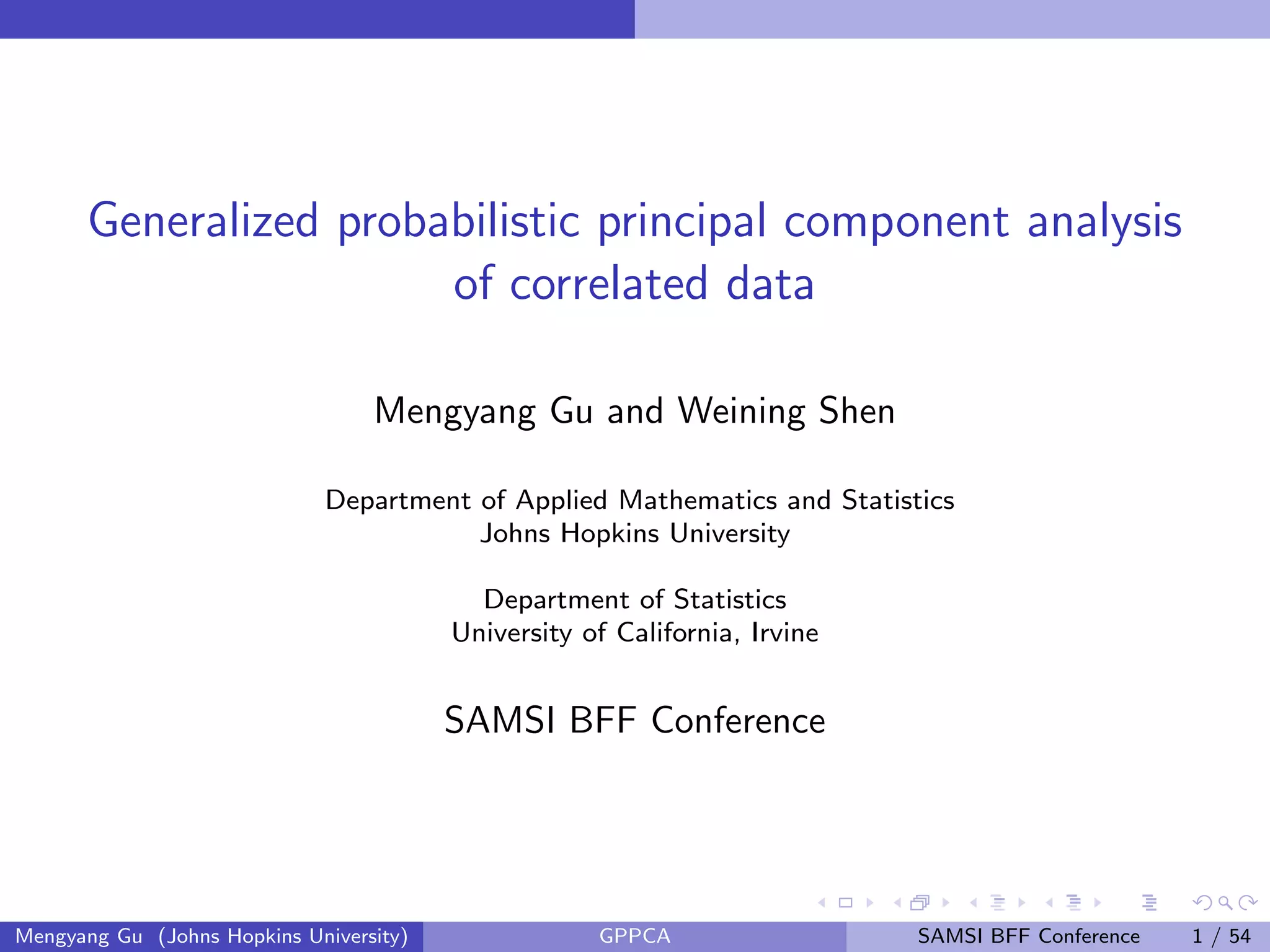 The document presents generalized probabilistic principal component analysis (GPPCA) of correlated data, highlighting its application in various contexts such as temperature anomaly modeling and ground deformation analysis. It discusses both simulated and real-world examples to illustrate the methodology's effectiveness, as well as future research directions. The session was part of a conference by Meng Yang Gu and Weining Shen from Johns Hopkins University and UC Irvine.