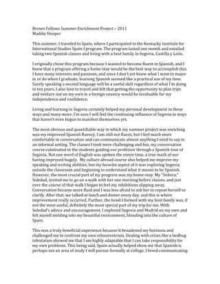 Maddie Hooper participated in a one-month study abroad program in Segovia, Spain where she took Spanish classes and lived with a host family. The program improved her Spanish fluency through conversation classes and exploring the city independently. Her most significant progress came from daily conversations with her host mother, which increased her comfort speaking Spanish. While the experience broadened her horizons, it also revealed that while she enjoyed communicating with locals, she is more interested in English literature than formally studying Spanish in college.