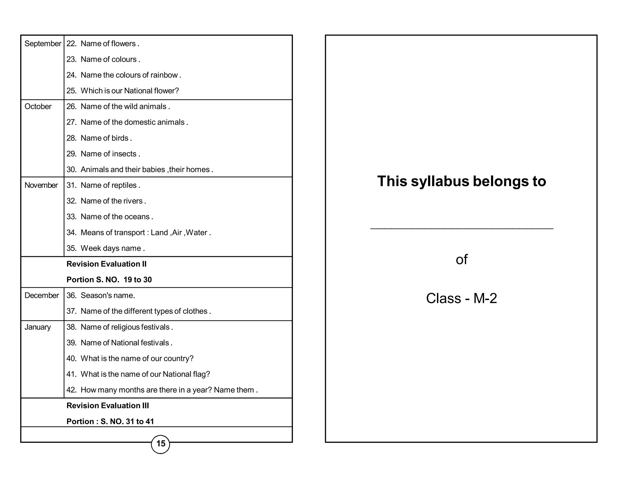 This document contains a syllabus for an M-2 class covering various subjects from September to February. The syllabus includes topics in English, Conversation, Art & Craft, Mathematics, General Knowledge, Hindi, and Revision Evaluations covering portions of the previously taught material. Specific topics listed include names of flowers, colors, animals, means of transportation, body parts, manners, family members, parts of plants, fruits/vegetables, alphabet, addition/subtraction, seasons, festivals, and more. The syllabus is broken down by month with designated textbook pages and content listed for each subject.
