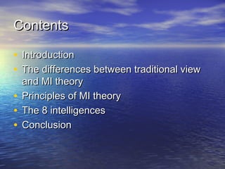 Multiple intelligences theory proposes that intelligence is comprised of at least 8 different intelligences rather than a single general intelligence measured by IQ tests. The 8 intelligences are verbal/linguistic, logical/mathematical, visual/spatial, bodily/kinesthetic, musical/rhythmic, interpersonal, intrapersonal, and naturalist. The theory challenges traditional views of intelligence being fixed and centered around language and logic abilities, instead suggesting intelligences can be strengthened and individuals have unique intelligence profiles.