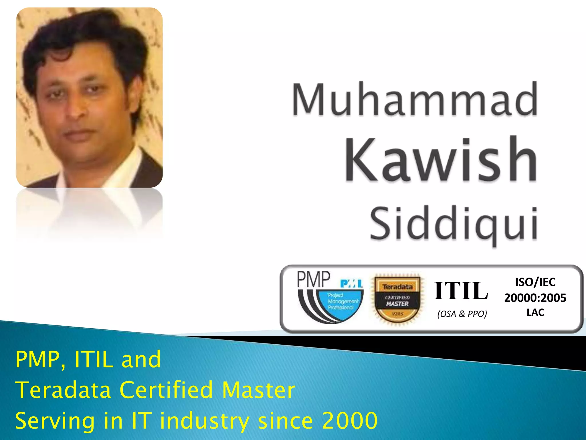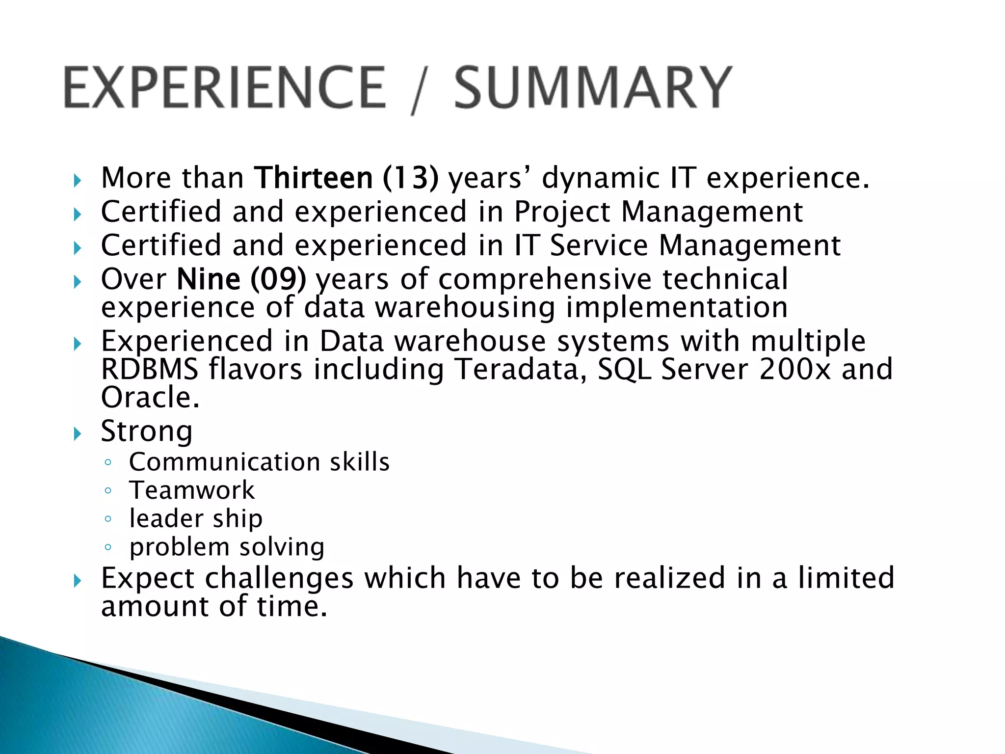This individual has over 13 years of experience in IT with expertise in project management, IT service management, data warehousing implementation, and working with various database management systems including Teradata, SQL Server, and Oracle. They hold several certifications including PMP, ITIL intermediate certifications, and are a Teradata Certified Master. Currently they work as a Teradata consultant helping clients with areas like ITSM, database design, performance management, and analytics.