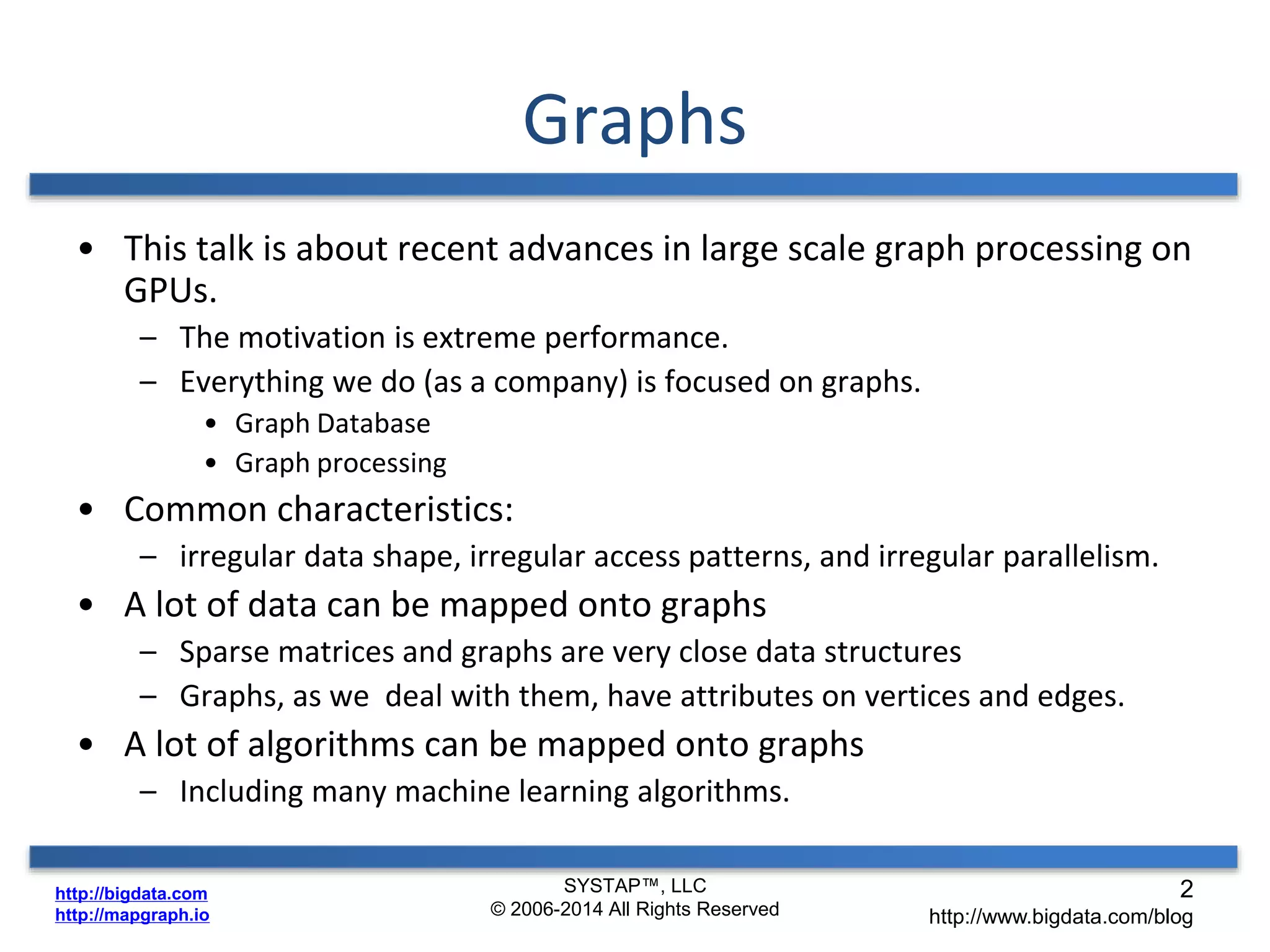 The document discusses the advancements in large-scale graph processing on GPUs, highlighting the high performance and scalability of graph databases and analytics. It emphasizes the advantages of using GPU architecture for graph algorithms, achieving significant speed improvements over traditional methods. Additionally, it outlines the necessity of optimizing storage and computation patterns for efficient performance in graph analytics.