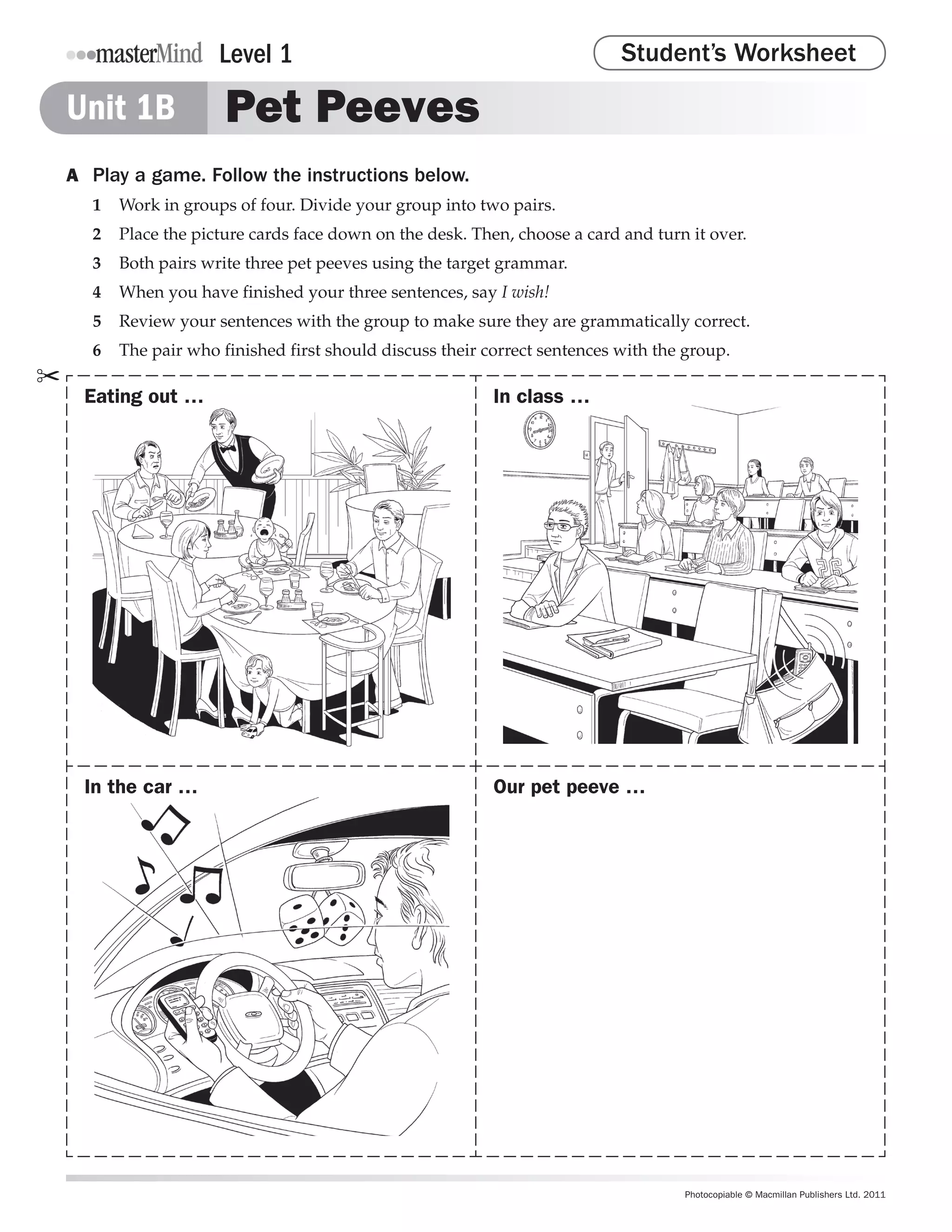 The document provides instructions for an activity where students work in groups of four to write sentences about pet peeves using the grammar structure "I wish + would/wouldn't + verb". The activity involves students dividing into pairs, choosing picture prompt cards, writing three pet peeve sentences each, and reviewing each other's work. The teacher's notes provide additional guidance for implementing the activity, including ways to score and discuss the activity.