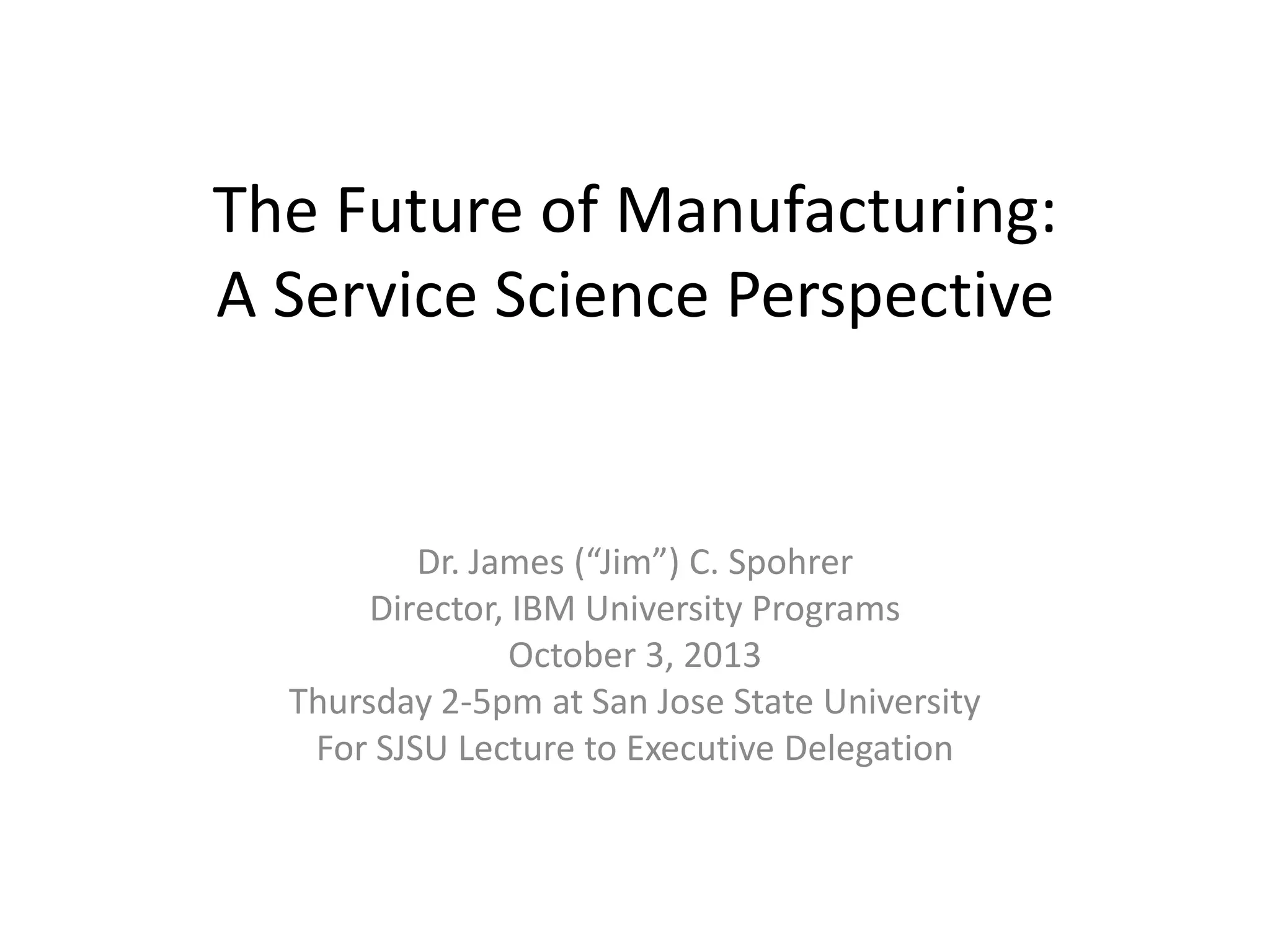 The document summarizes a presentation by Dr. James Spohrer on the future of manufacturing from a service science perspective. The key points are: