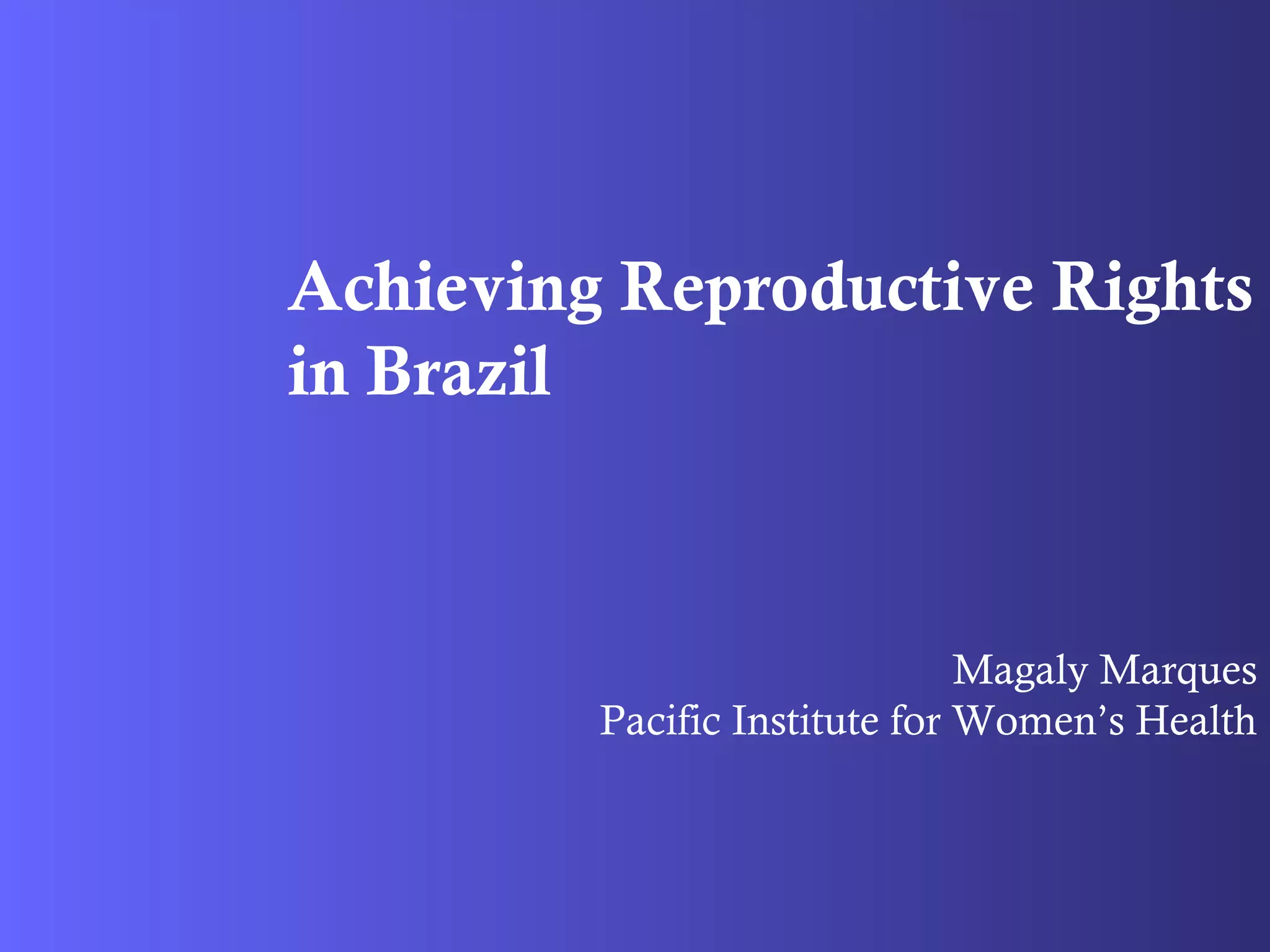 This document summarizes the achievement of reproductive rights in Brazil from the 1970s to the early 2000s. It describes the political and social context, including a military dictatorship, high maternal mortality, and population control programs. Civil society mobilized through women's groups to advocate for democratic reforms and reproductive rights. Key achievements included new policies promoting reproductive health, reduced maternal mortality, expanded prenatal care and abortion access. Continued challenges include full abortion access and increasing women's leadership.