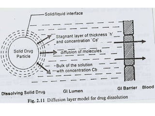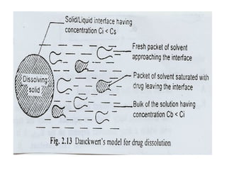 2. There are several theories that describe the drug dissolution process, including the diffusion layer model, penetration or surface renewal theory, and interfacial barrier model. The most common model is the diffusion layer model, which involves the formation of a saturated film at the solid/liquid interface and diffusion of the drug through this layer.