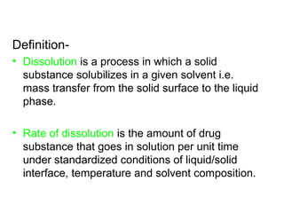 1. Dissolution is the process by which a solid substance dissolves in a solvent to form a solution. The rate of dissolution depends on factors like temperature, solvent composition, and the liquid/solid interface area.