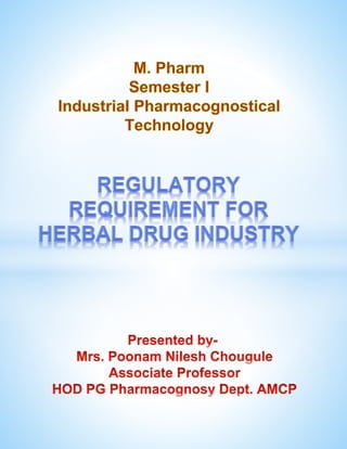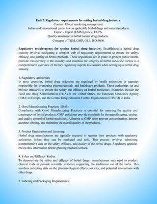 Establishing a herbal drug industry requires navigating complex regulatory requirements related to safety, efficacy, quality and public health. Key aspects include complying with Good Manufacturing Practices, obtaining product licenses by submitting data on safety and efficacy to regulatory authorities, adhering to labeling and packaging guidelines, implementing quality control testing, monitoring adverse events, and ensuring compliance with international standards such as those of the International Conference on Harmonisation. Meeting these regulatory standards contributes to the success, credibility and public health impact of the herbal drug industry.