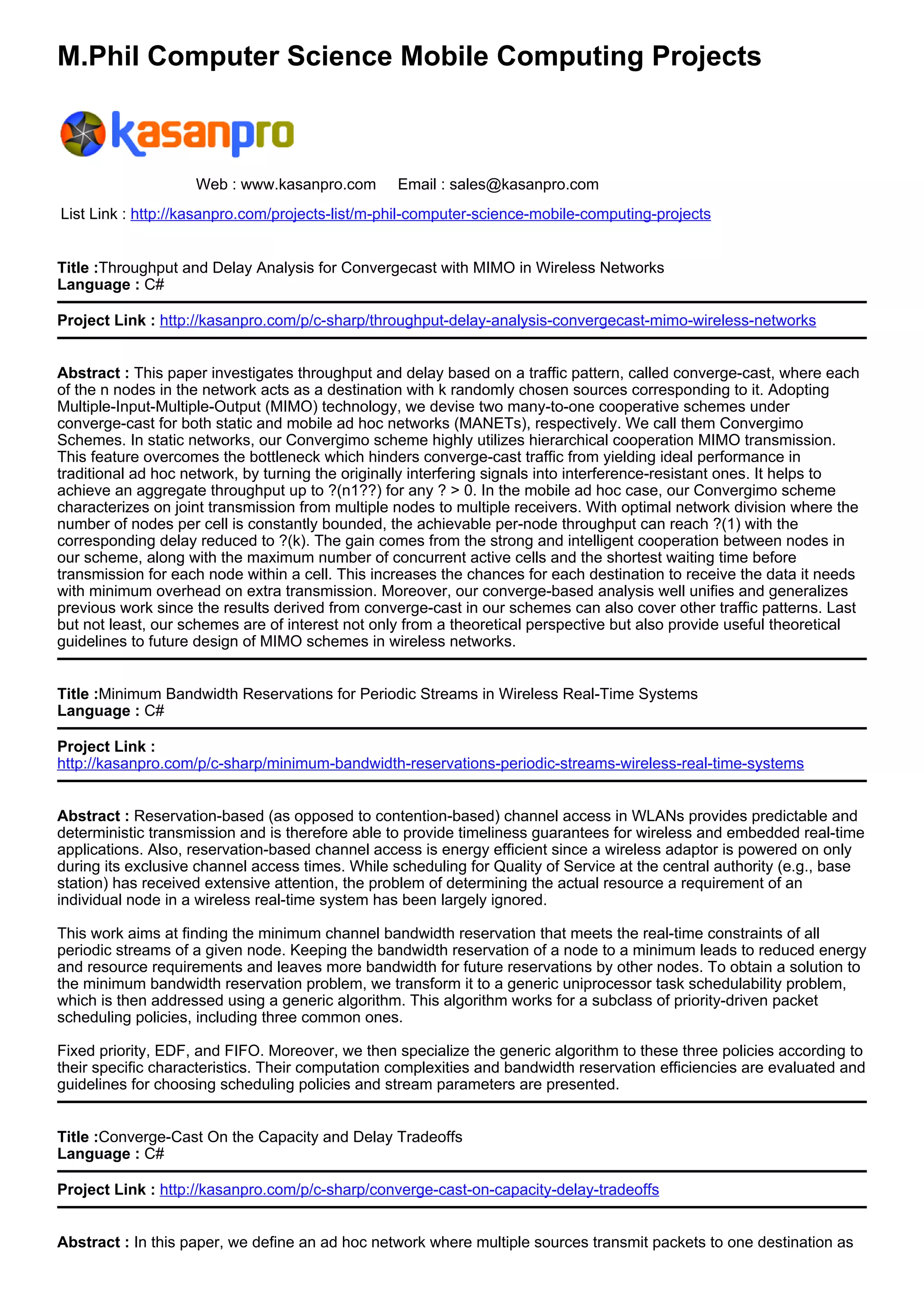 This document lists several M.Phil Computer Science Mobile Computing project titles and abstracts. It describes projects related to throughput and delay analysis using MIMO in wireless networks, minimum bandwidth reservations for periodic streams in wireless real-time systems, converge-cast capacity and delay tradeoffs, optimal location updates in mobile ad hoc networks, fast data collection in tree-based wireless sensor networks, and optimal scheduling for multi-radio multi-channel cognitive cellular networks. The projects involve using techniques like MIMO, bandwidth reservations, converge-cast analysis, location updates, data collection trees, and multi-radio scheduling to analyze performance metrics in wireless networks and mobile computing systems.