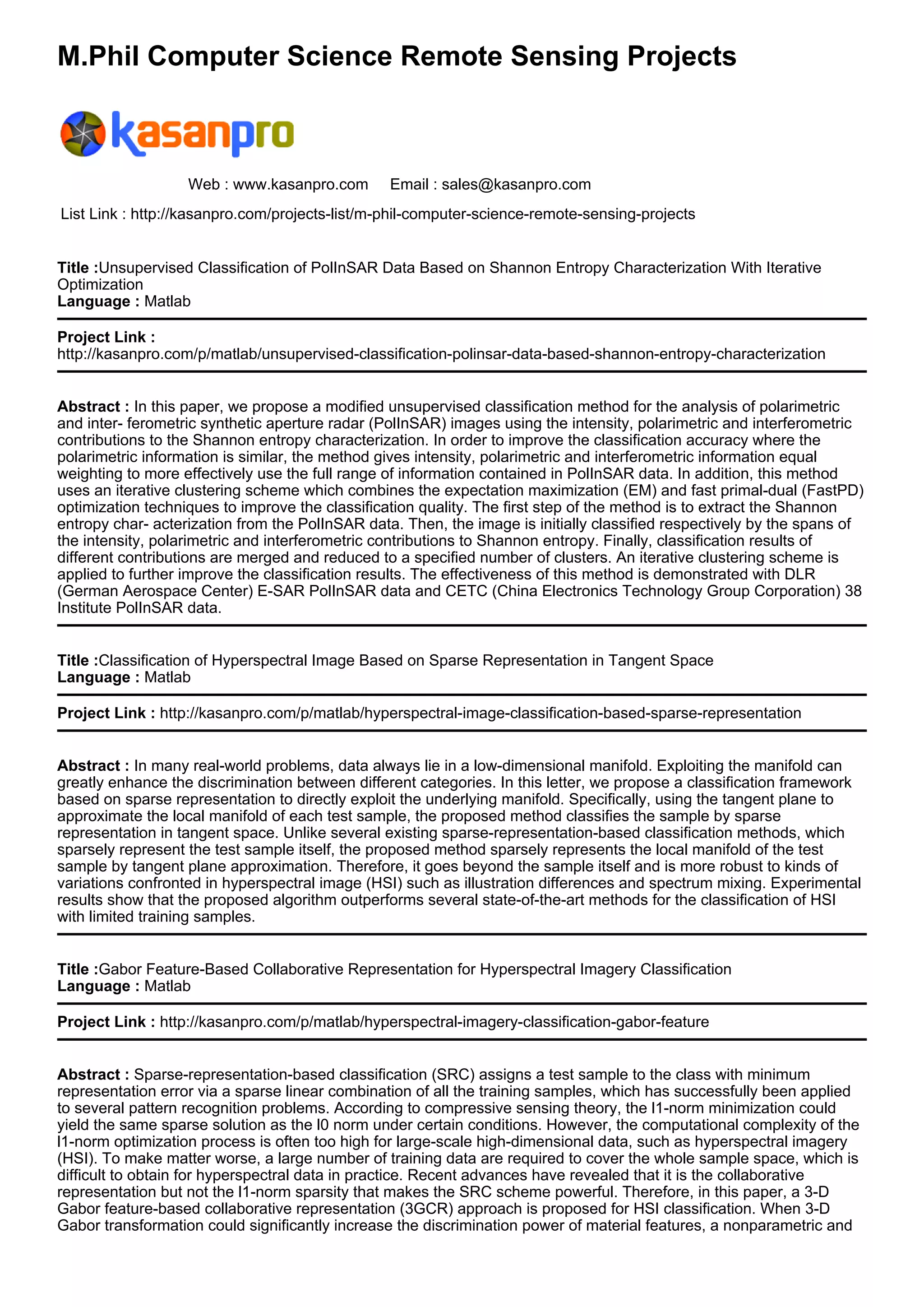 The document presents various projects and methodologies in remote sensing and hyperspectral image classification, detailing innovative techniques such as unsupervised classification methods, sparse representation, and adaptive image segmentation. Key contributions include improvements in classification accuracy using iterative optimization and feature extraction methods, along with enhancements in computational efficiency for remote sensing image processing. The projects demonstrate practical applications and experimental results showcasing the effectiveness of these methods across different datasets.