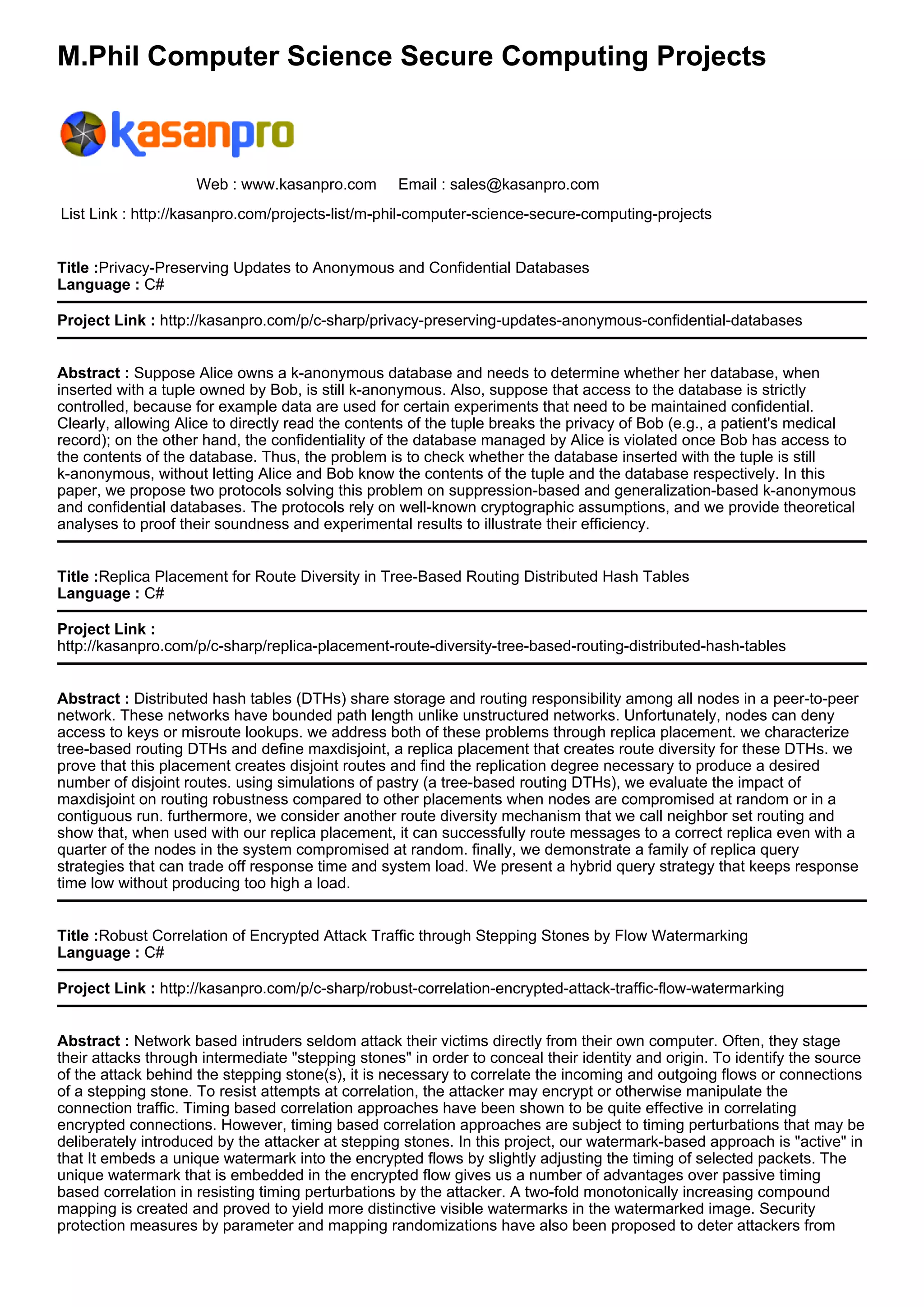 The document outlines various secure computing projects in computer science, detailing protocols and algorithms designed to address issues like privacy, data sharing, and network security. Notable projects include privacy-preserving techniques for anonymous databases, fault tolerance in wireless sensor networks, and efficient data extraction from digital media. Each project utilizes methods like cryptographic assumptions, machine learning, and novel algorithms to enhance security and efficiency in different contexts.