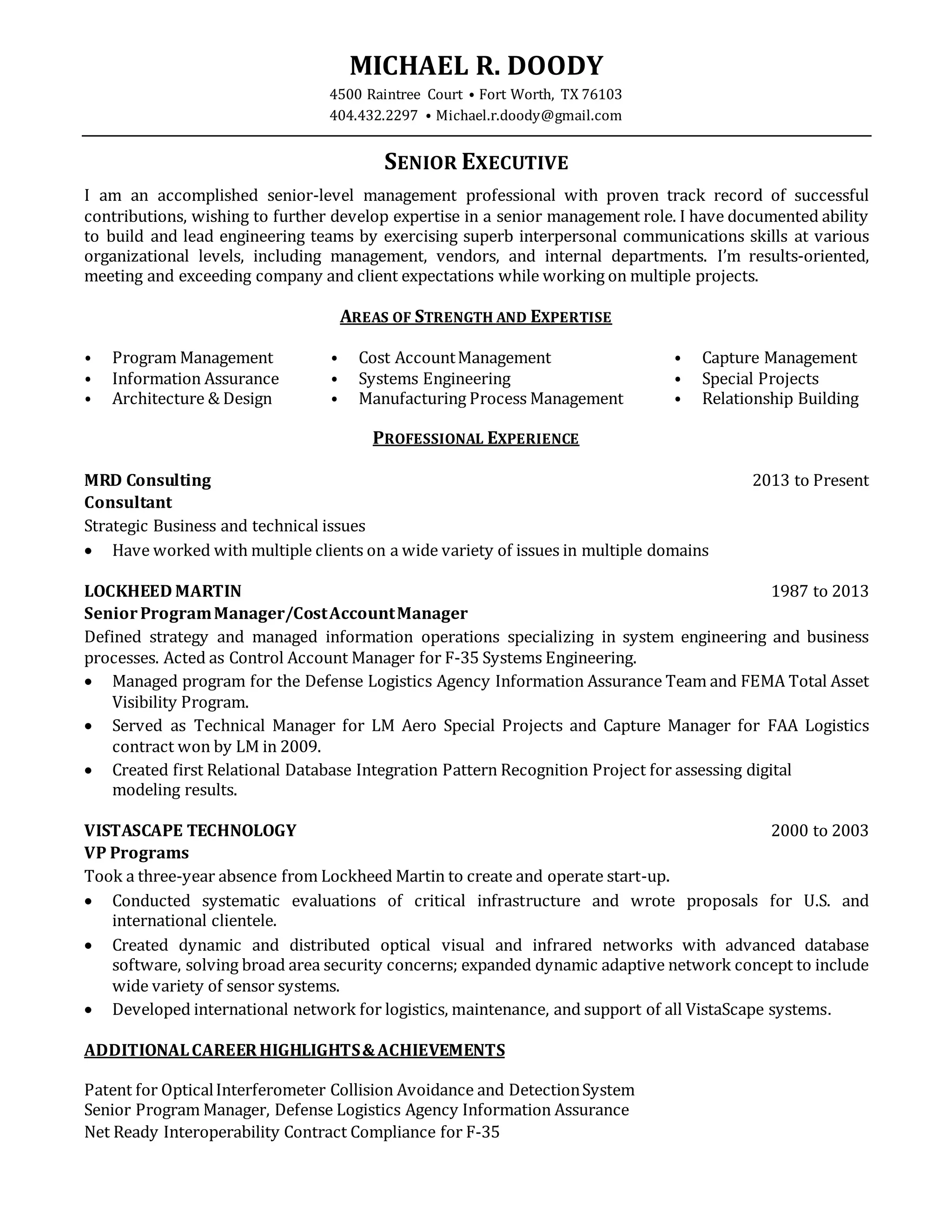 Michael Doody is a senior executive with over 30 years of experience in program management, systems engineering, and business development. He has a proven track record of managing large programs and teams at Lockheed Martin, where he was a senior program manager and cost account manager. Currently, he works as an independent consultant, advising clients on strategic and technical issues. Doody holds certifications in program and cost management, and has authored publications on defense systems and electronic warfare.