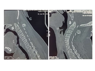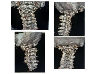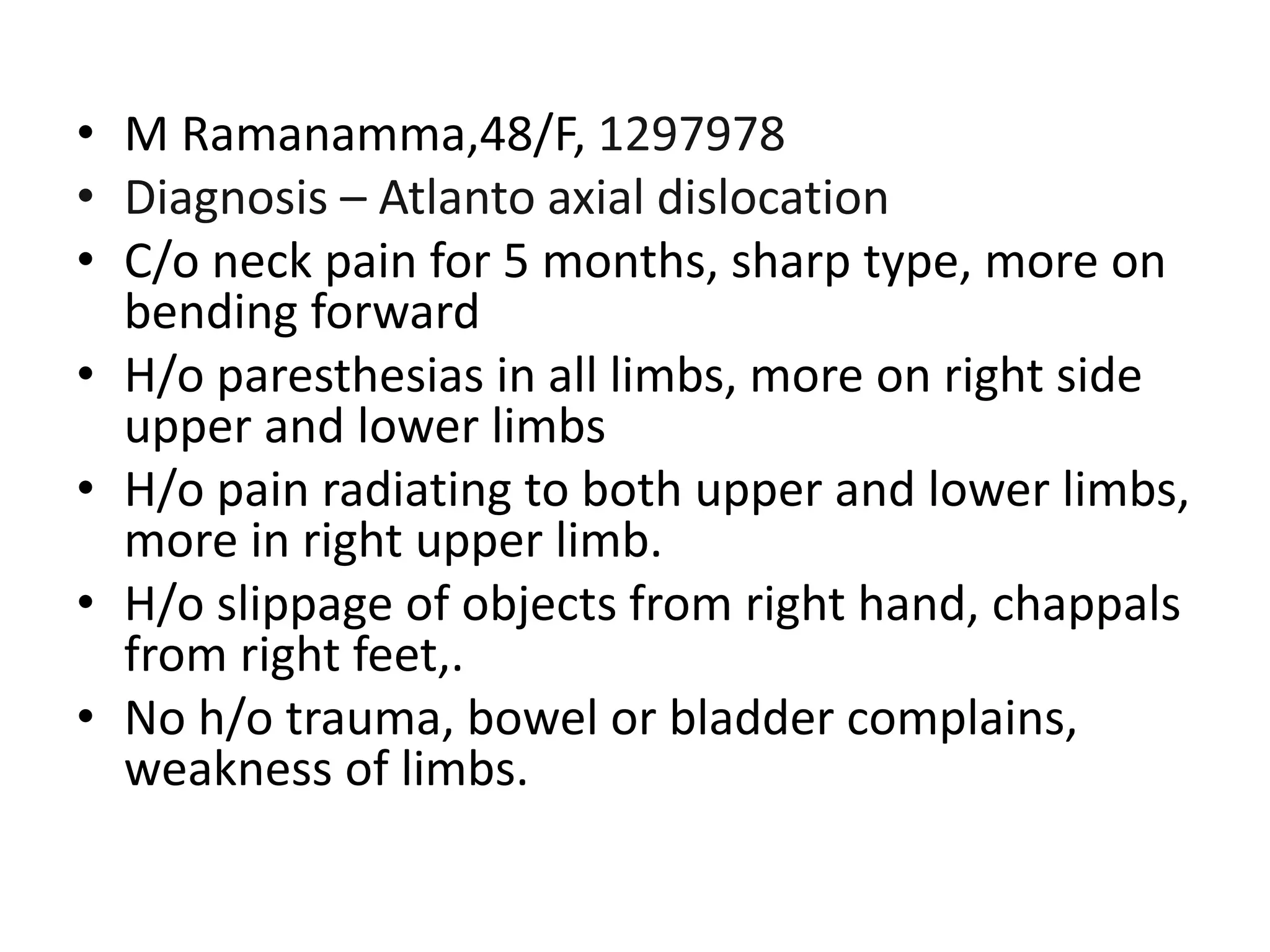 M Ramanamma is a 48-year-old female who presented with neck pain and paresthesias in her limbs for the past 5 months. On examination, she had decreased strength in her right upper and lower limbs and hypertonia in her lower limbs. Imaging showed atlantoaxial dislocation with compression of the cervical spinal cord at C1-C2, explaining her symptoms.