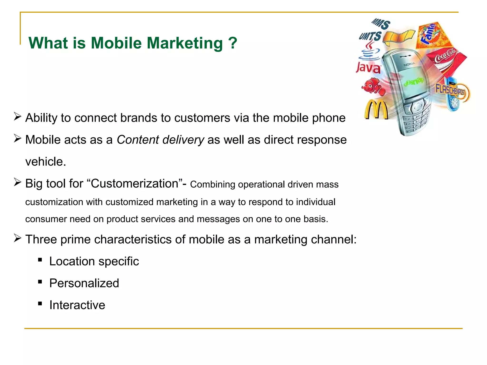 Mobile marketing allows brands to connect with customers via their mobile phones. It is a powerful tool for customization and personalized messaging. Mobile has three key characteristics - it is location-specific, personalized, and interactive. Consumers are increasingly using their phones beyond calls for content, making mobile data and rich media desirable. The document then discusses various mobile marketing campaigns, formats, trends, and technologies that enable mobile advertising. It also outlines several mobile marketing services offered by the platform m-REACH, including SMS marketing, mobile coupons, picture classifieds, appointment booking, and more.