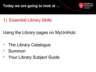 This document provides an overview of an introductory library skills session for an MSc in Biomedical Science program. It covers essential library resources like the library catalogue, Summon, and subject guides. It also covers literature searching skills like developing search strategies, using databases like Medline and Science Direct to find articles, and accessing full texts. Other topics covered include identifying peer-reviewed articles, comparing Google Scholar and Web of Science, and referencing.
