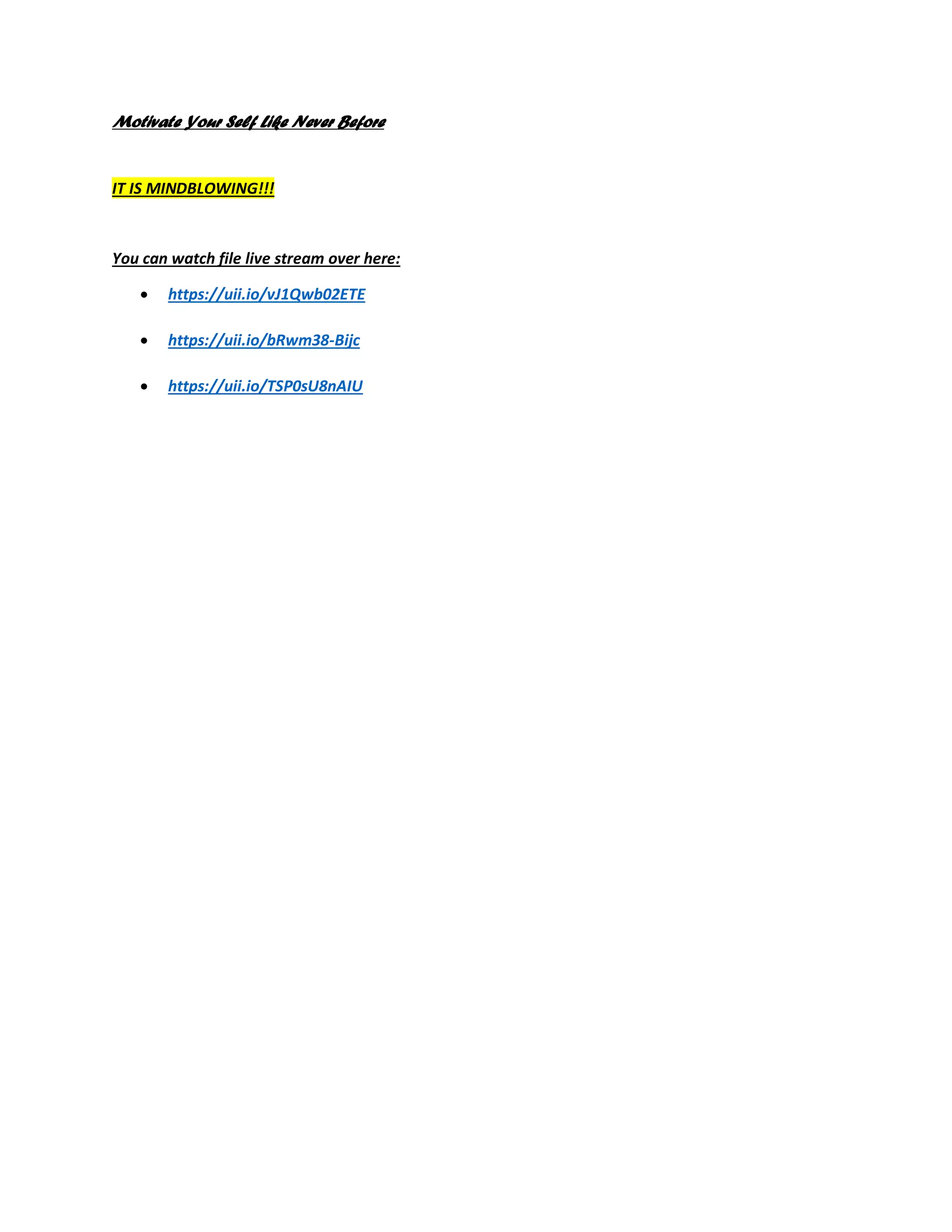 This document provides links to live stream videos intended to highly motivate the viewer. It promises motivation like never before and includes 3 separate links to live stream files on motivational topics on uii.io.