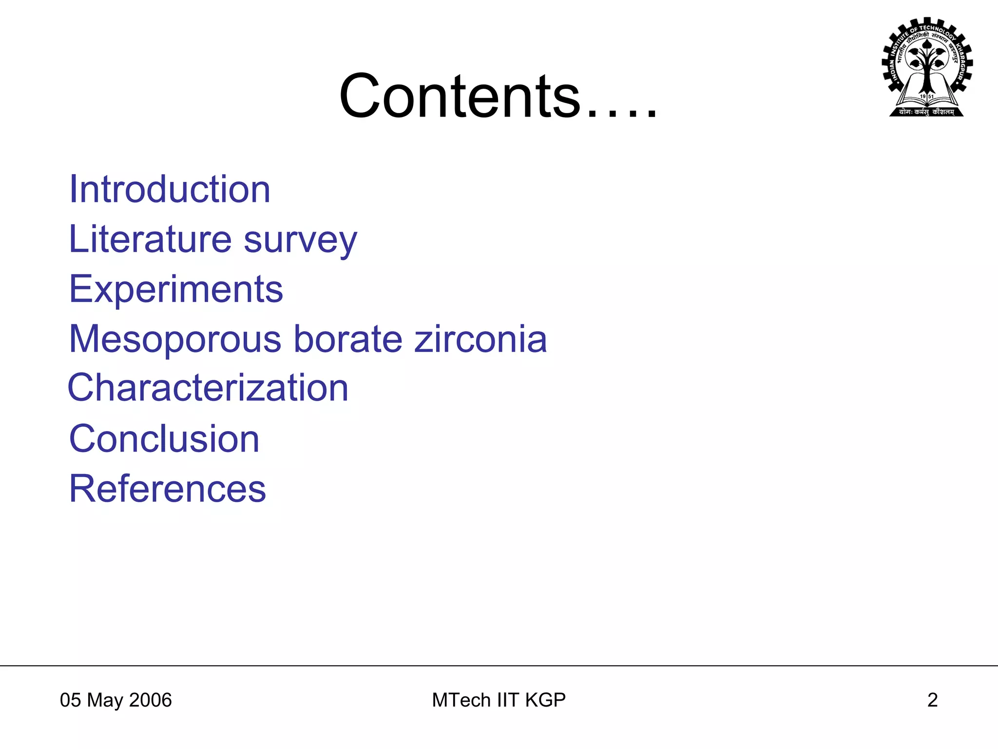 This document discusses the modification and application of a borate zirconia catalyst for improving alkylation reactions in various chemical processes. It highlights the preparation methods, characterization, and performance of mesoporous borate zirconia, indicating its potential for enhancing selectivity and stability in producing ortho-alkylates. The results suggest that the catalyst may offer significant benefits for the chemical industry, particularly in fine chemical production.