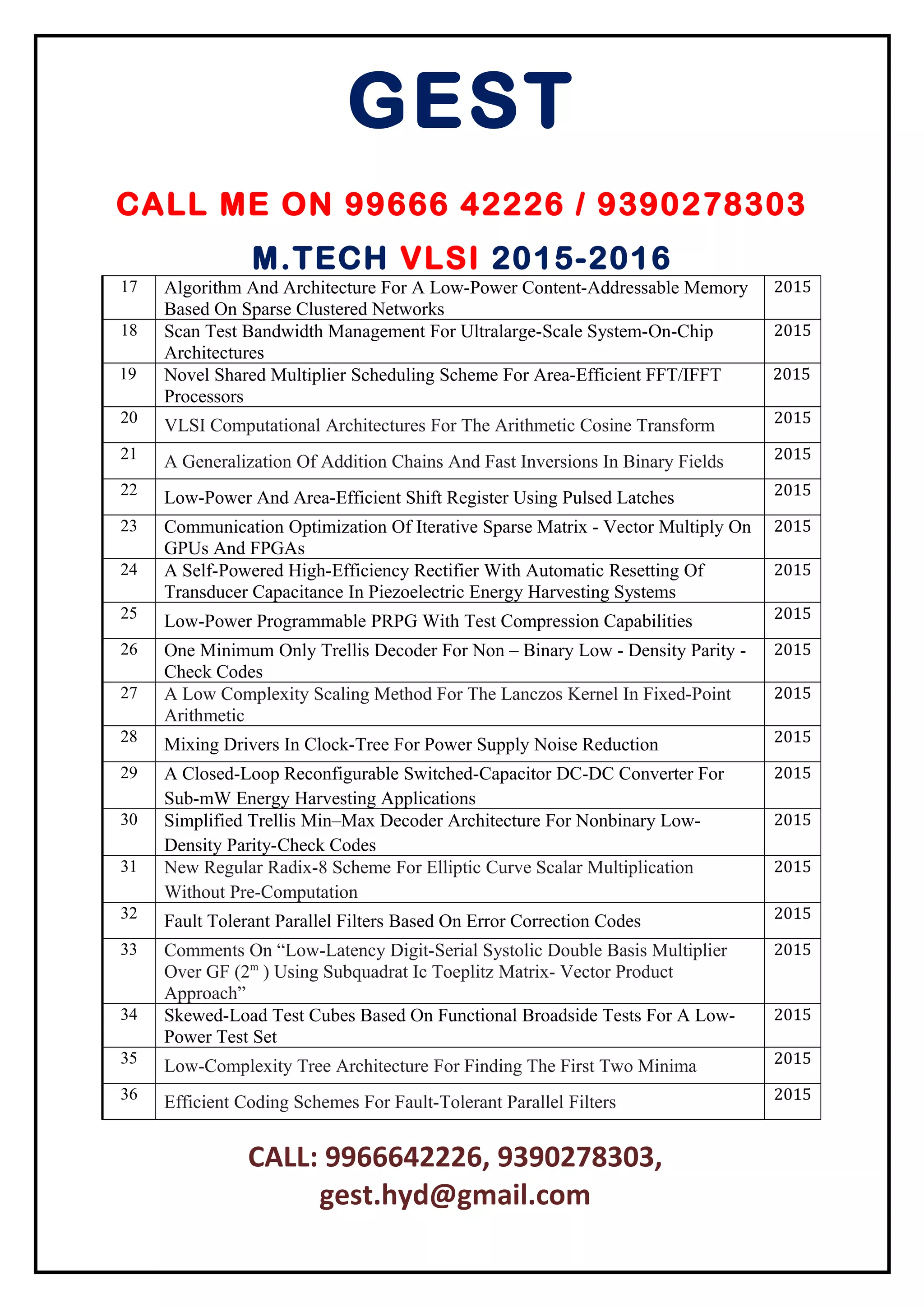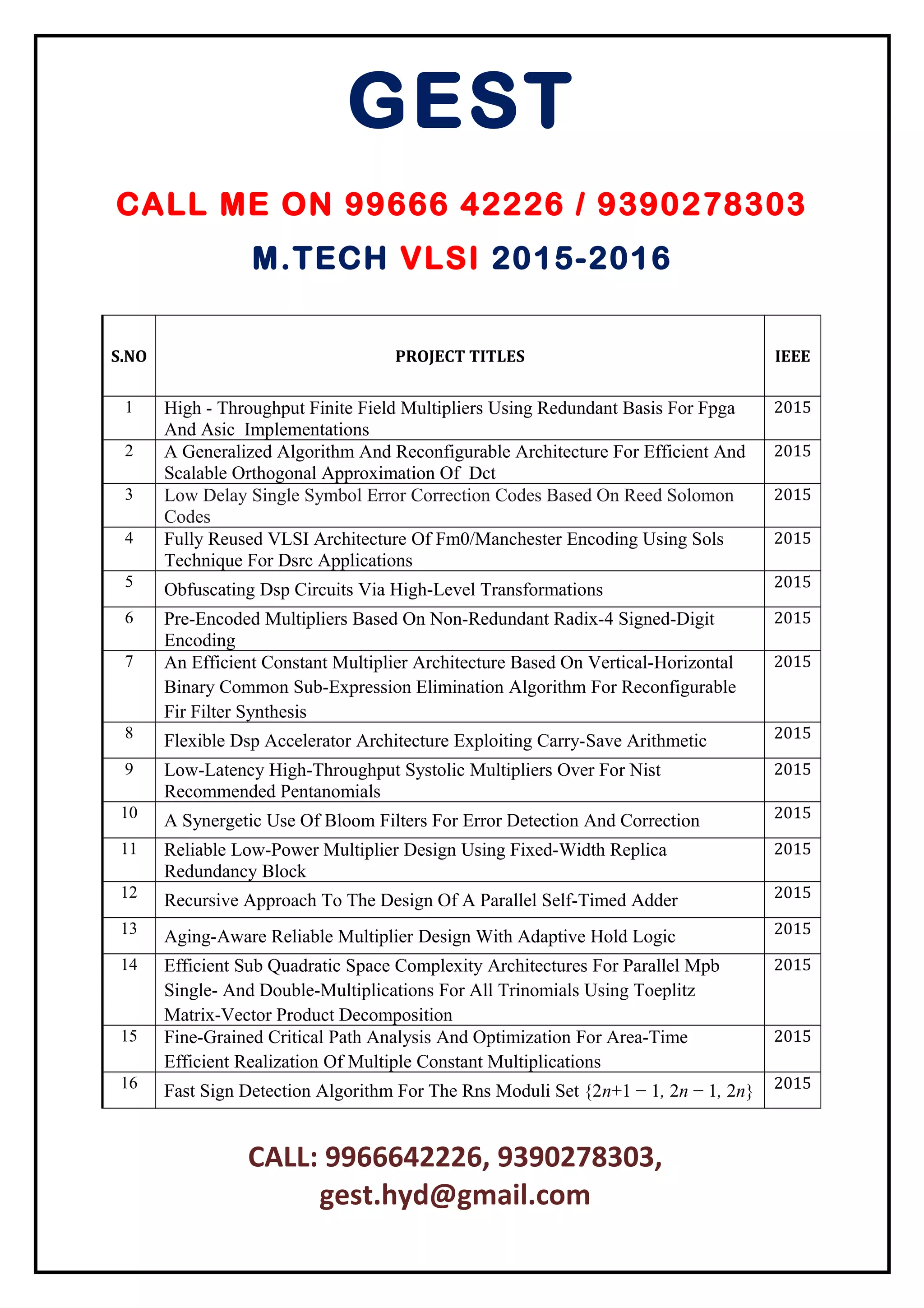The document lists 70 M.Tech VLSI projects from 2015-2016, including their titles and years of completion. It provides contact information for GEST, including phone numbers 99666 42226 and 9390278303, and an email of gest.hyd@gmail.com. The projects cover a range of topics in VLSI design including multipliers, DSP circuits, error correction codes, and testing.