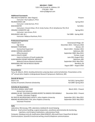 The document is a resume for Melissa F. Terry that outlines her education in neuroscience from Johns Hopkins University, research experience including marine biology and animal behavior studies, and work history in veterinary and animal care fields demonstrating over 2 years of laboratory and surgical experience working with small animals.