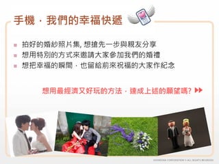手機,我們的幸福快遞 拍好的婚紗照片集, 想搶先一步與親友分享 想用特別的方式來邀請大家參加我們的婚禮 想把幸福的瞬間,也留給前來祝福的大家作紀念 想用最經濟又好玩的方法,達成上述的願望嗎?