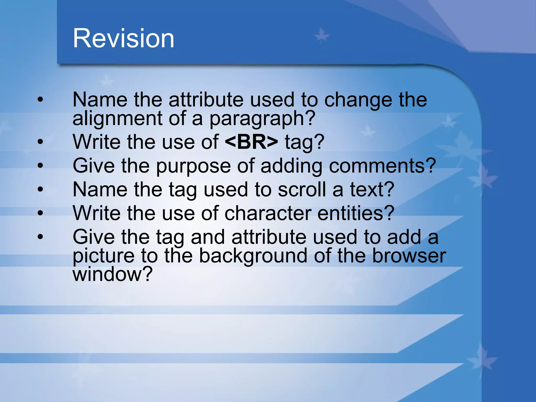 The document discusses HTML tags for formatting text. It describes the <B> tag for bolding text, the <I> tag for italicizing text, and the <U> tag for underlining text. Examples are given of each tag. Students are instructed to create a webpage explaining these tags and identifying them in sample code. The key tags covered are <B> for bold, <I> for italic, and <U> for underline.