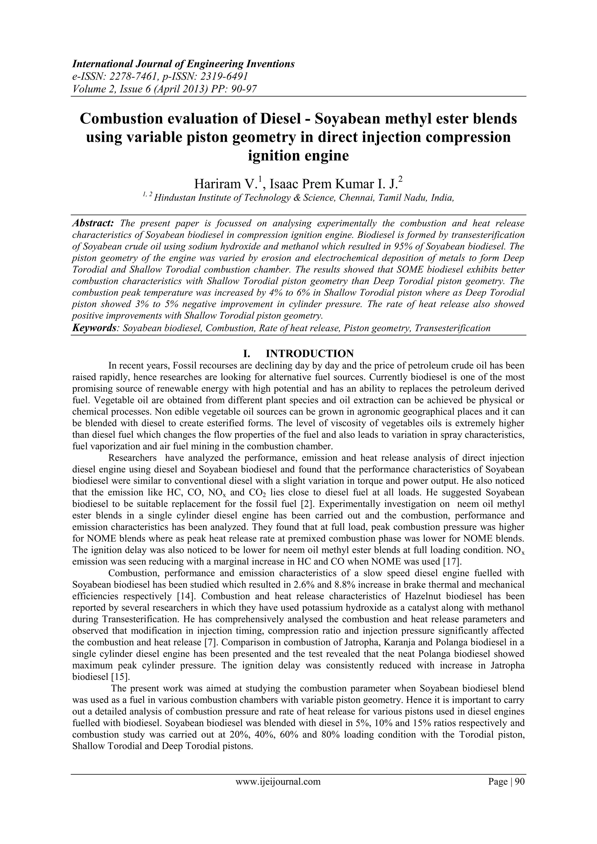 1. The document analyzes combustion and heat release characteristics of a diesel engine fueled with blends of soybean biodiesel and diesel. Soybean oil was converted to biodiesel via transesterification, producing soybean methyl ester (SOME) biodiesel.