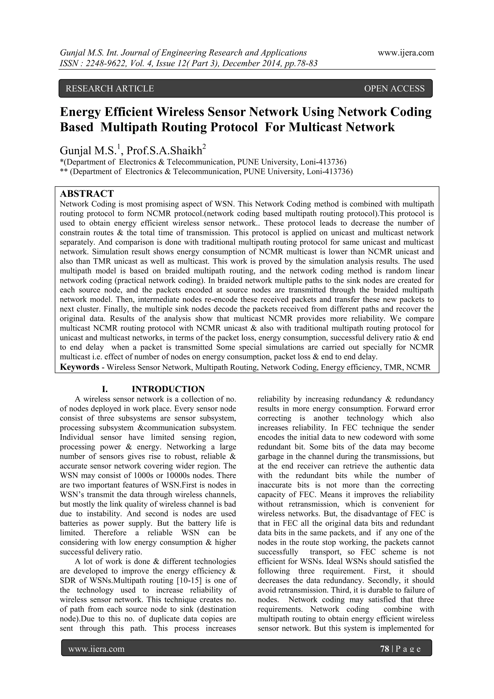 This document presents the development of an energy-efficient wireless sensor network (WSN) using a network coding-based multipath routing protocol known as NCMR. The protocol is analyzed for both unicast and multicast networks, demonstrating that multicast NCMR provides lower energy consumption and higher reliability compared to traditional multipath routing protocols. Simulation results support the protocol's effectiveness in reducing transmission times and enhancing successful delivery ratios while addressing challenges like node failures.