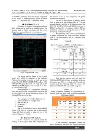 K. Vinay Kumar et al designed an efficient arithmetic logic unit (ALU) using low-power dual mode logic. Dual mode logic operates in both static and dynamic modes to overcome the disadvantages of each. The authors implemented a 1-bit ALU using dual mode logic gates on Cadence in 180nm technology. They compared the power dissipation and delay of their ALU to a normal ALU. Their dual mode logic ALU had lower power dissipation and delay. They also analyzed how varying the width and length ratios of transistors in the design impacted power and speed. Their proposed low-power dual mode logic ALU achieved faster operation than a normal ALU within allowable power limits.