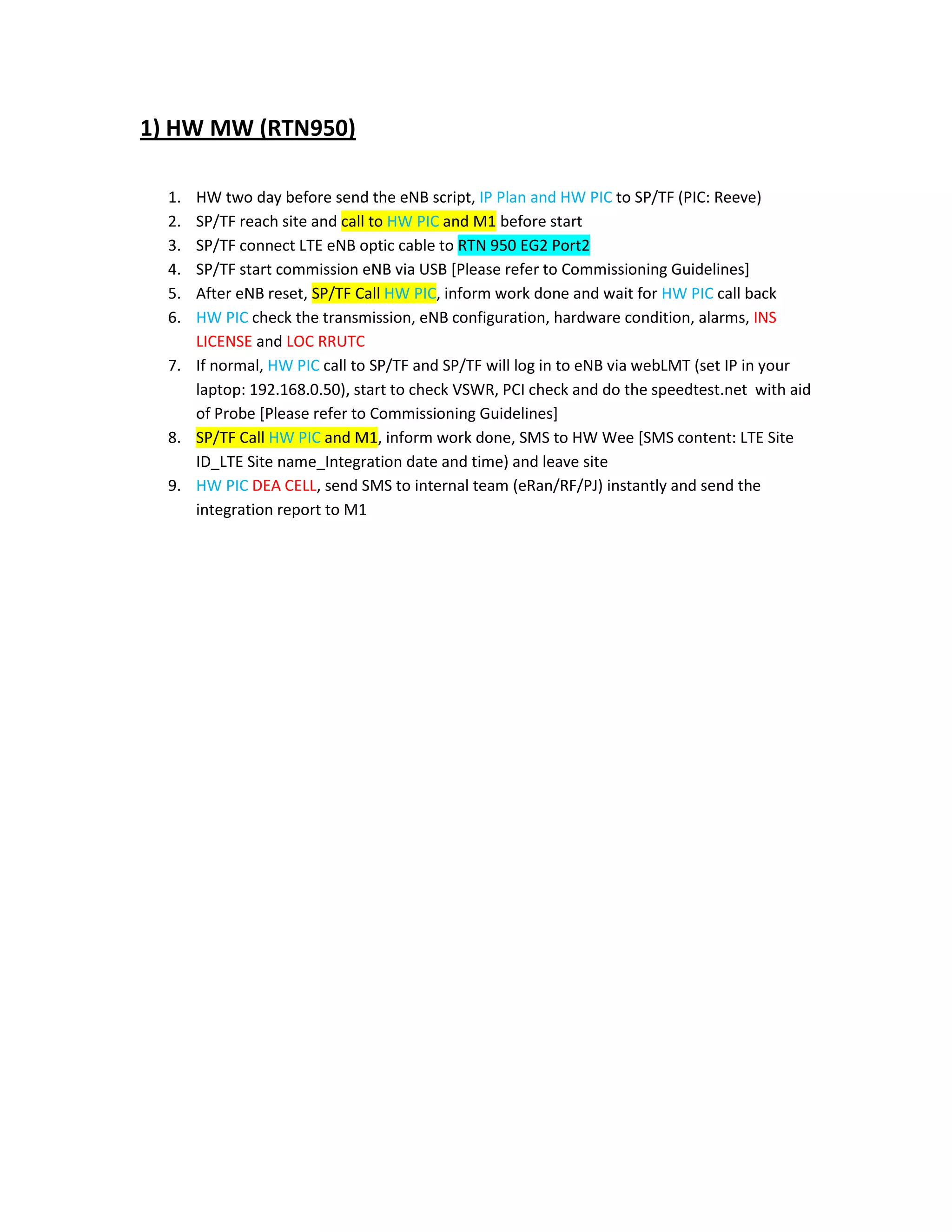 2) For a new integration, the steps include preparing hardware and software, installing cables, commissioning the eNB and ATN910, verifying IP connectivity and services.
