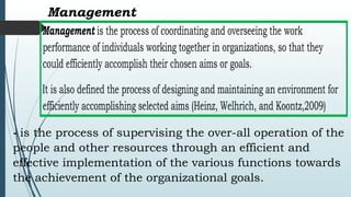 The document discusses the meaning and functions of management, emphasizing the importance of coordinating resources to achieve organizational goals. It outlines key management functions such as planning, organizing, staffing, leading, and controlling, as well as various management theories, including scientific management, administrative management, and total quality management. Additionally, it highlights the significance of understanding these theories to improve management practices in response to changing times.