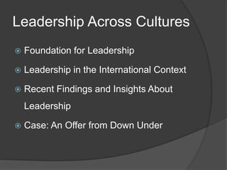 This document discusses leadership across different cultures. It begins by defining leadership and examining philosophical approaches to management like Theory X, Y and Z. It then explores leadership styles, behaviors and how they vary across cultures like the US, Europe, Middle East, developing countries, Japan and more. Transformational leadership is discussed as an effective universal style. The document concludes with a hypothetical case study about an American retailer expanding internationally and the leadership challenges that may arise.
