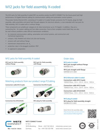 The document outlines the M12 jacks for field assembly, specifically x-coded options, designed for high-performance 10 gigabit Ethernet cabling and communication systems. It details product specifications, including varieties with and without flanges and their suitability for industrial environments, while also highlighting transmission characteristics and IP67 protection. The document emphasizes robust design features, UL approval in preparation, and provides links for further information and assembly guidance.
