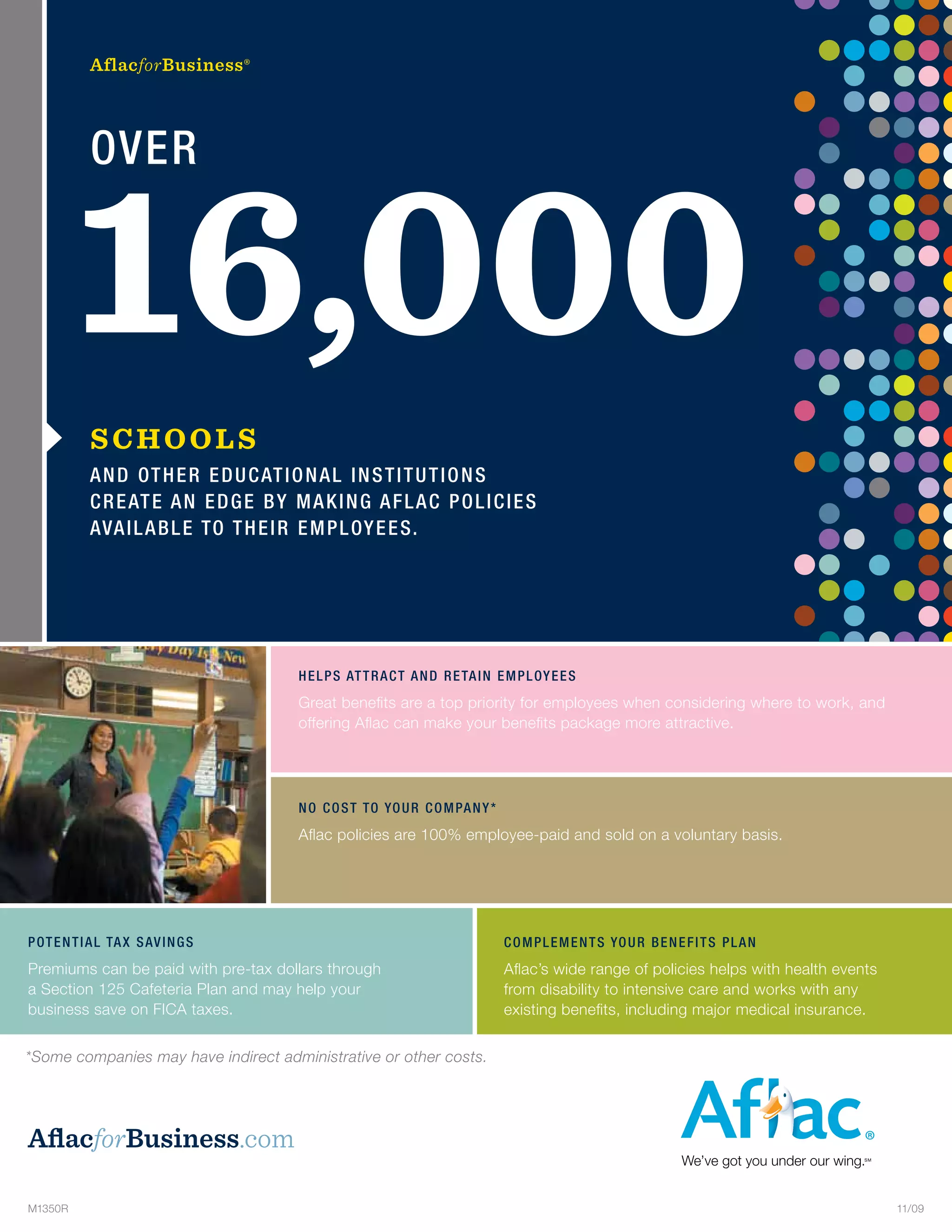 Aflac provides supplemental insurance policies to over 16,000 schools and other educational institutions to help attract and retain employees. Offering Aflac's policies can enhance an employer's benefits package at no cost to the company since policies are employee-paid. Aflac's policies provide tax savings and complement existing benefits plans by covering expenses for health issues like disability and intensive care.