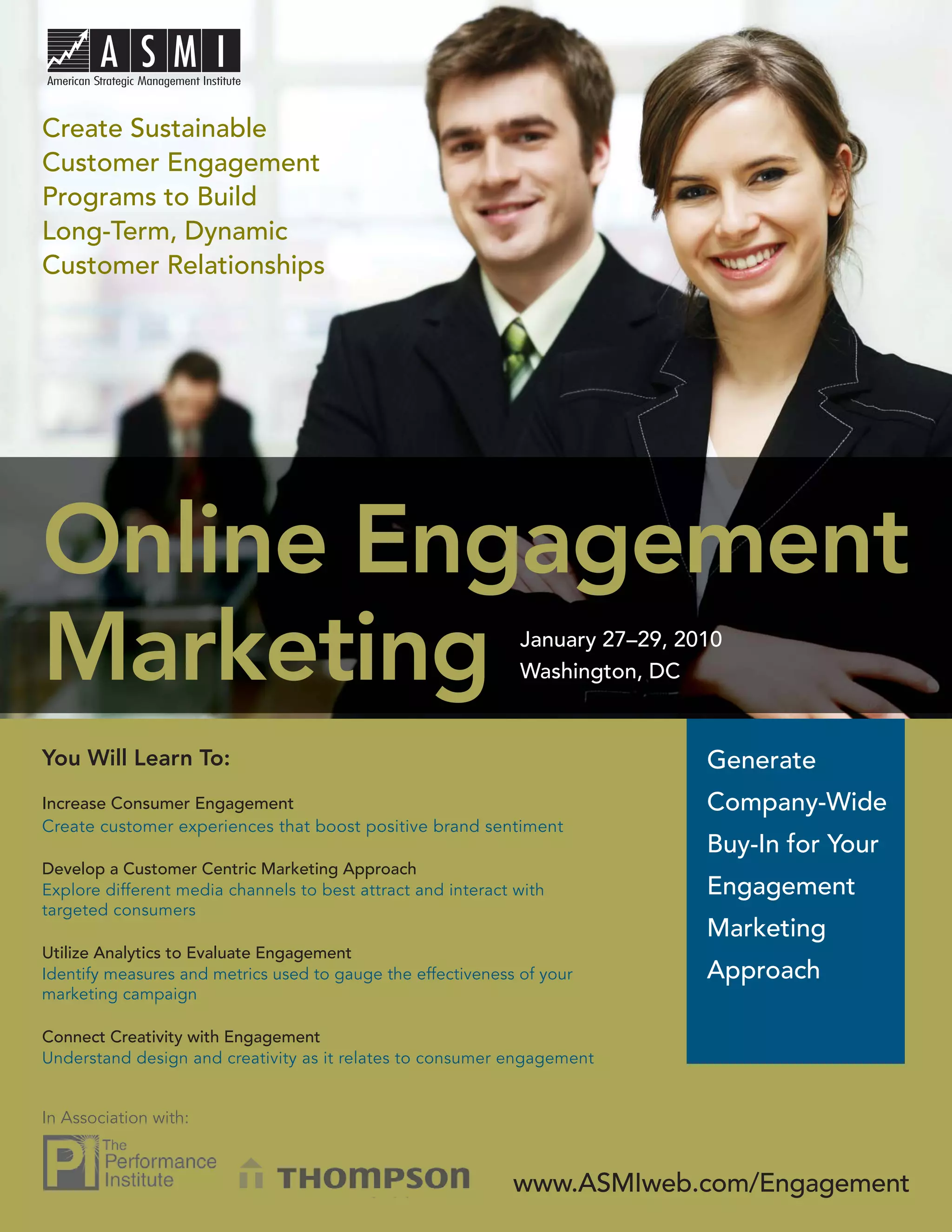 This document provides information about an upcoming conference on online engagement marketing. The conference will teach attendees how to generate company-wide buy-in for engagement marketing, utilize different media channels to interact with consumers, evaluate engagement using analytics, and connect creativity to engagement strategies. Key topics will include measuring the impact of marketing on attitudes and behavior, understanding the role of creativity, and communicating engagement as a primary strategy. Attendees will include those in marketing, advertising, promotions, brand management, and integrated marketing.