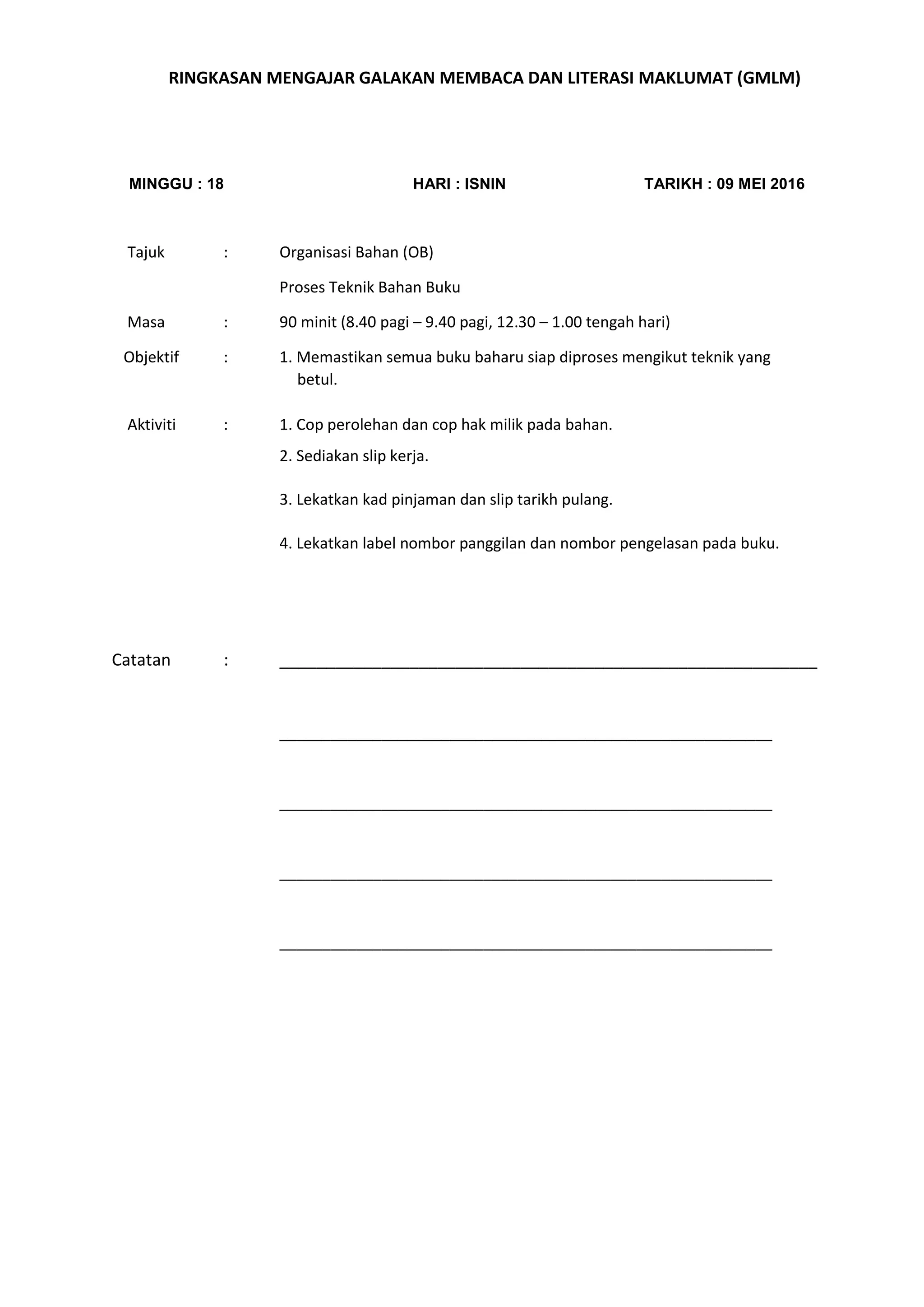 Dokumen ini merangkumi rancangan pengajaran harian untuk minggu ke-18 yang melibatkan pelbagai aktiviti dalam bidang seni visual dan pengurusan bahan buku. Objektif utama termasuk memastikan semua buku diproses dengan betul dan melaksanakan aktiviti kreatif seperti menghasilkan diorama dan topeng serkup. Terdapat juga penekanan terhadap galakan membaca dan literasi maklumat melalui rekod bacaan nilam.